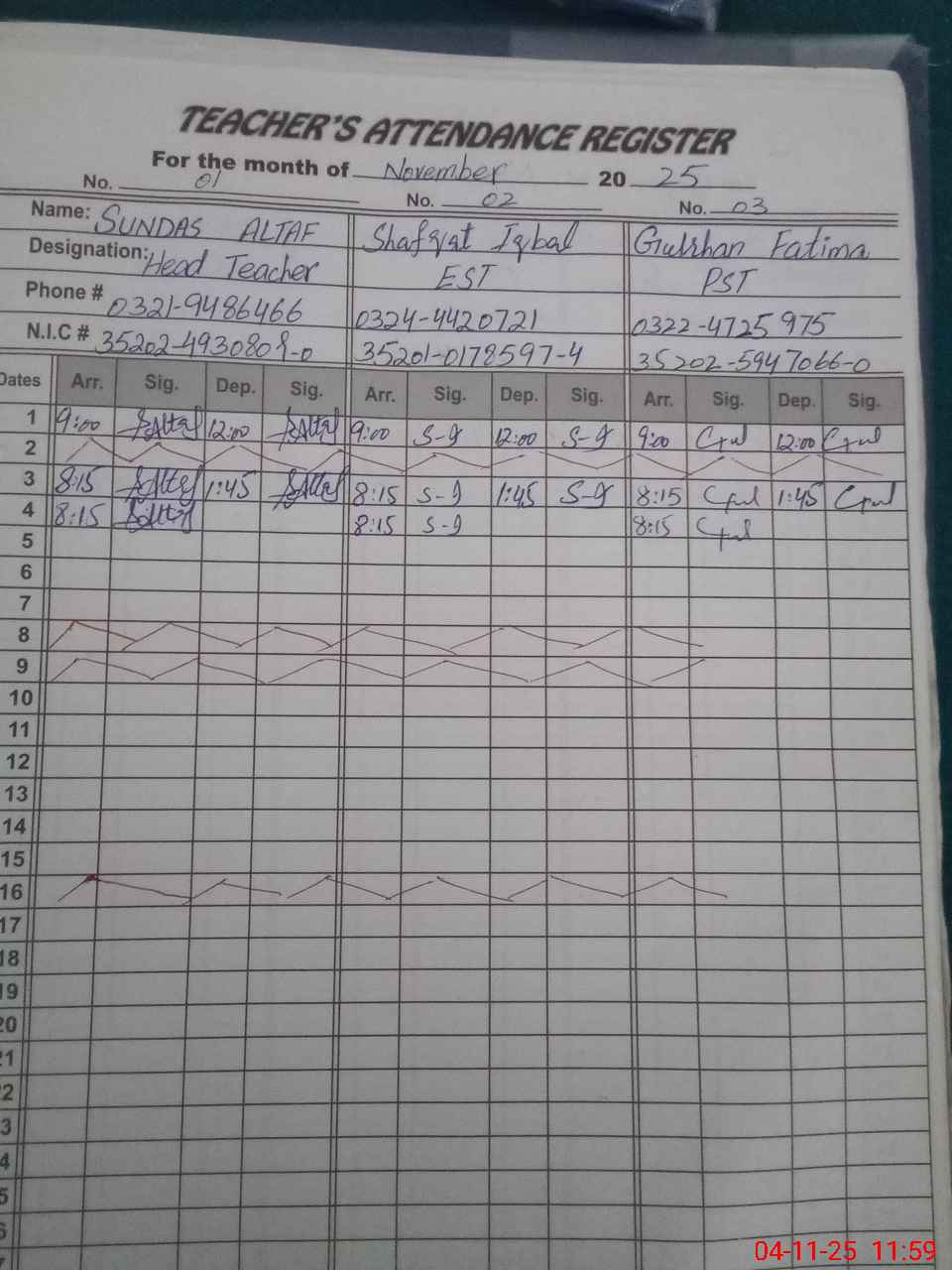 | CNIC | Full Name | Designation | R/C | Absence during last cal. month |