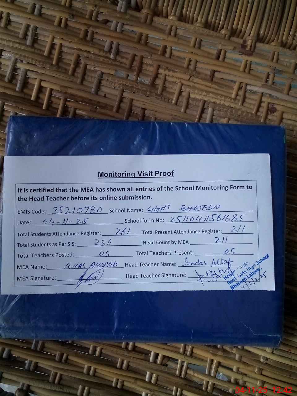 | Attendance Register | Head Teacher | MEA with School | Visit Proof |