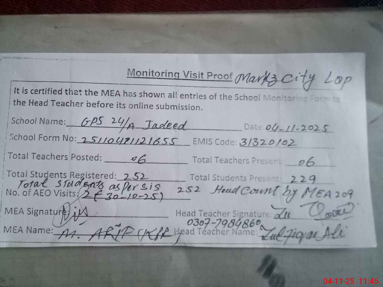 | Attendance Register | Head Teacher | MEA with School | Visit Proof |