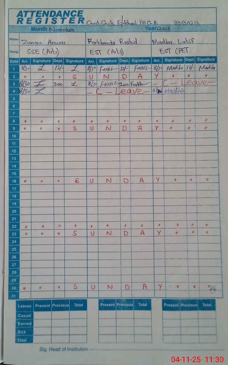 | CNIC | Full Name | Designation | R/C | Absence During Last Calender Month |