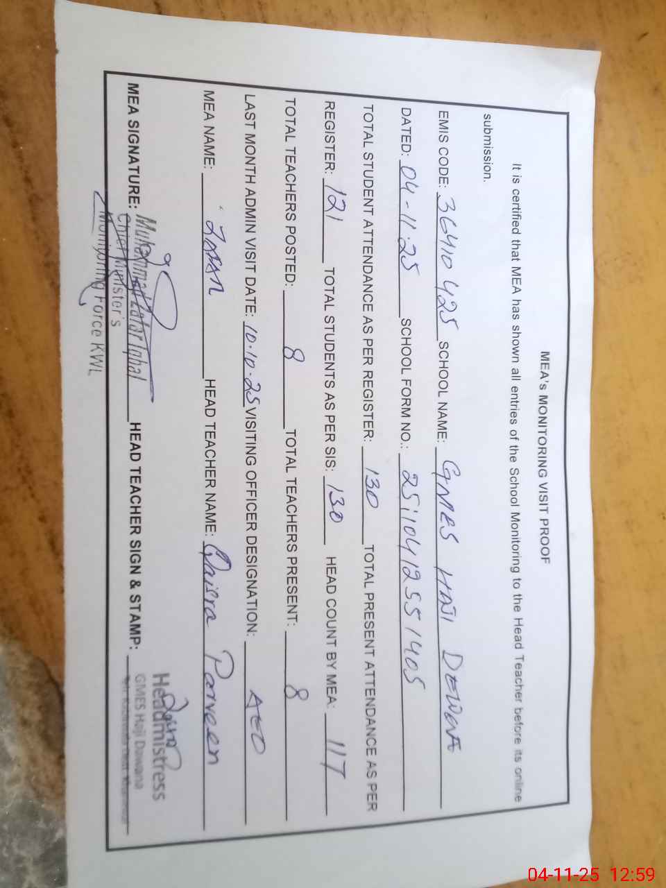 | Attendance Register | Head Teacher | MEA with School | Visit Proof |