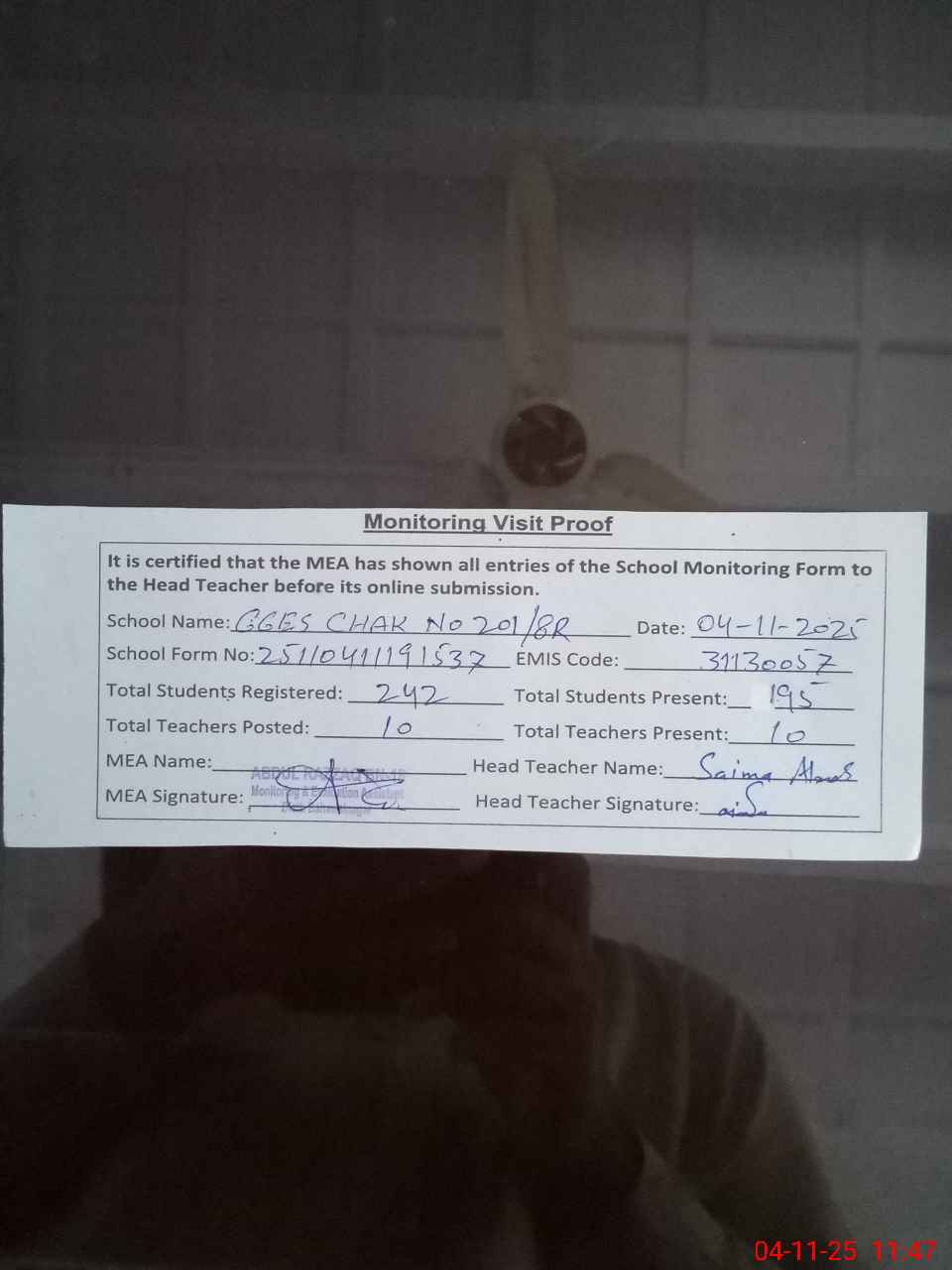 | Attendance Register | Head Teacher | MEA with School | Visit Proof |
