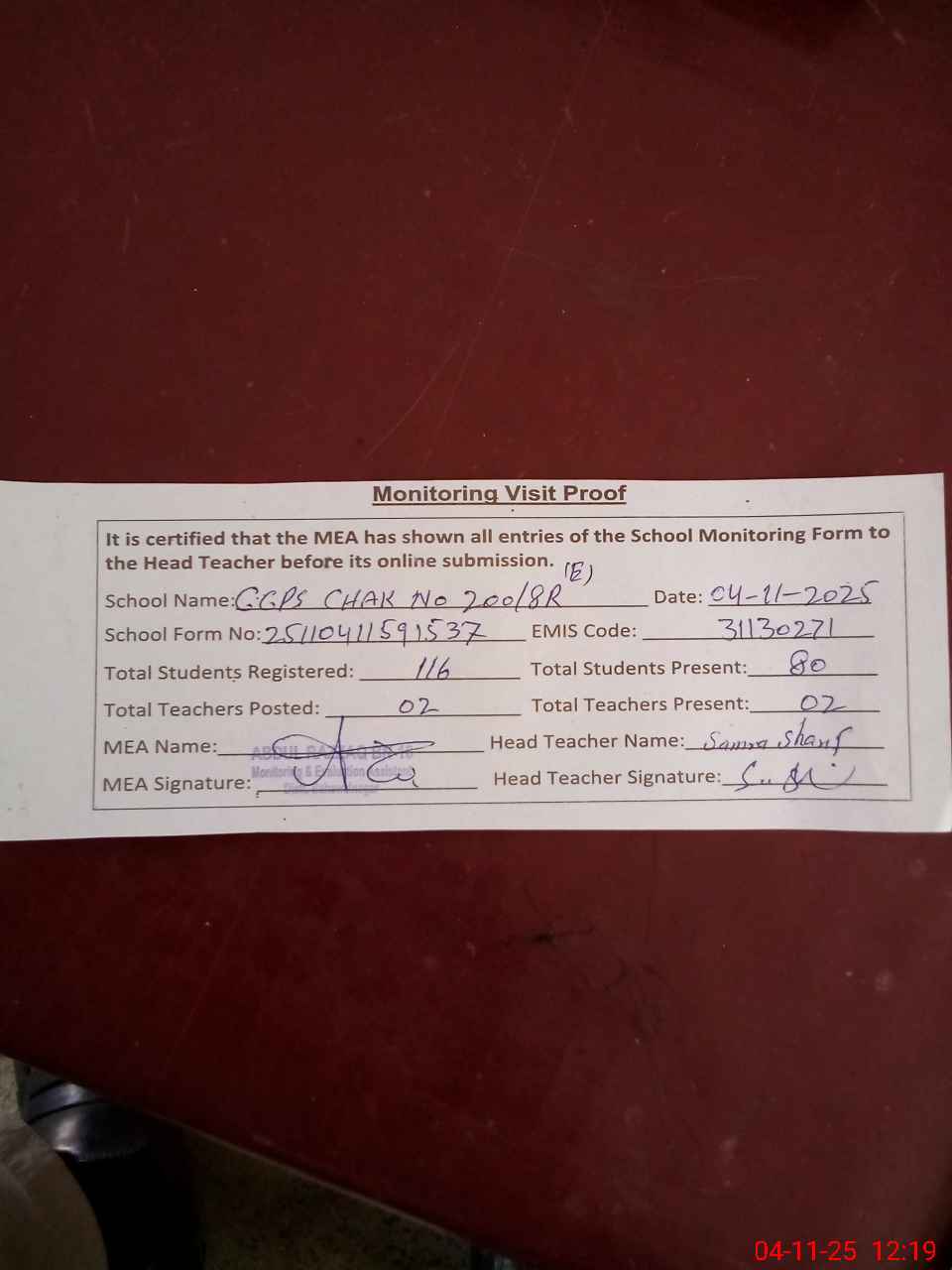 | Attendance Register | Head Teacher | MEA with School | Visit Proof |