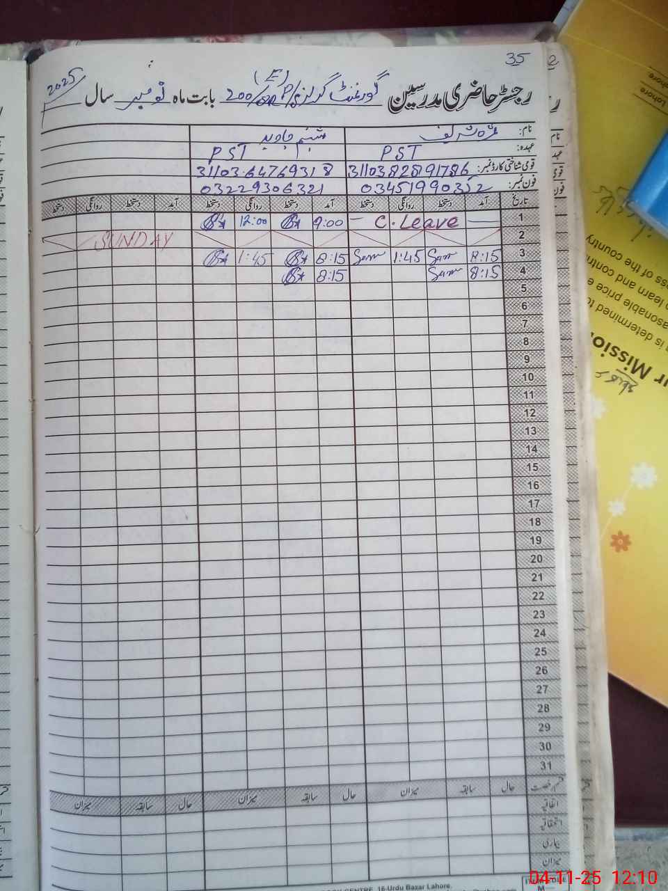 | CNIC | Full Name | Designation | R/C | Absence During Last Calender Month |
