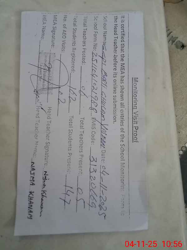 | Attendance Register | Head Teacher | MEA with School | Visit Proof |