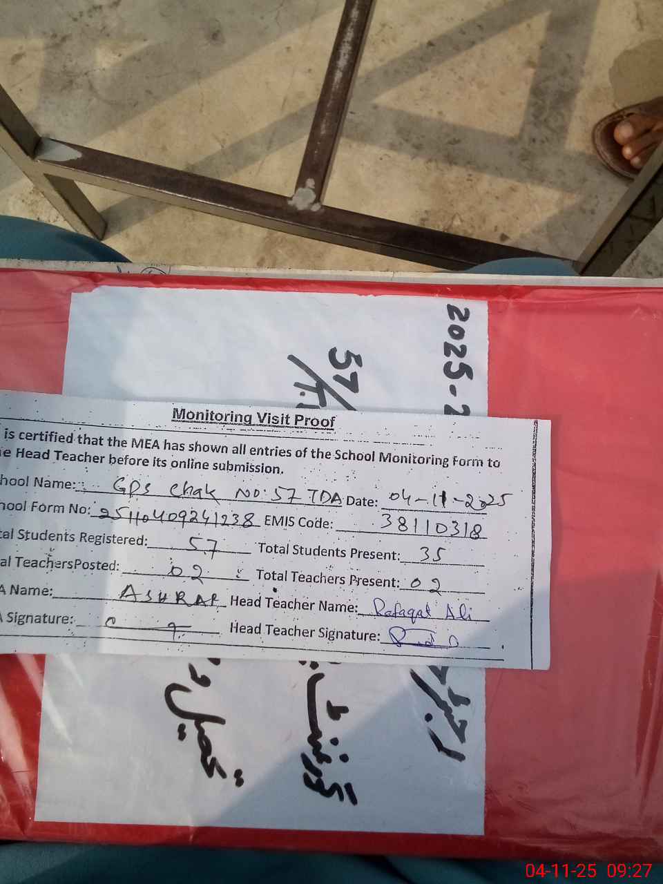 | EMIS Code: 38110318 | Name of School: GPS CHAK NO.57/TDA | |||