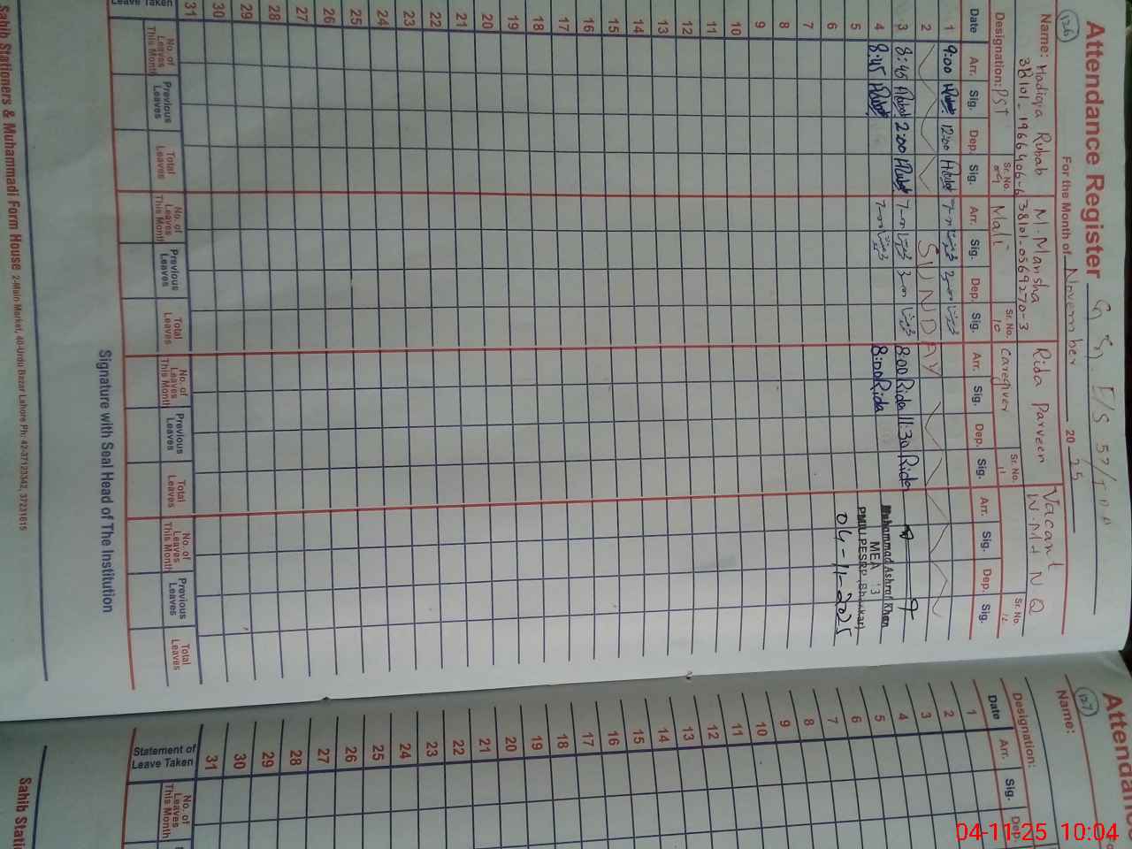 | CNIC | Full Name | Designation | R/C | Absence During Last Calender Month |
