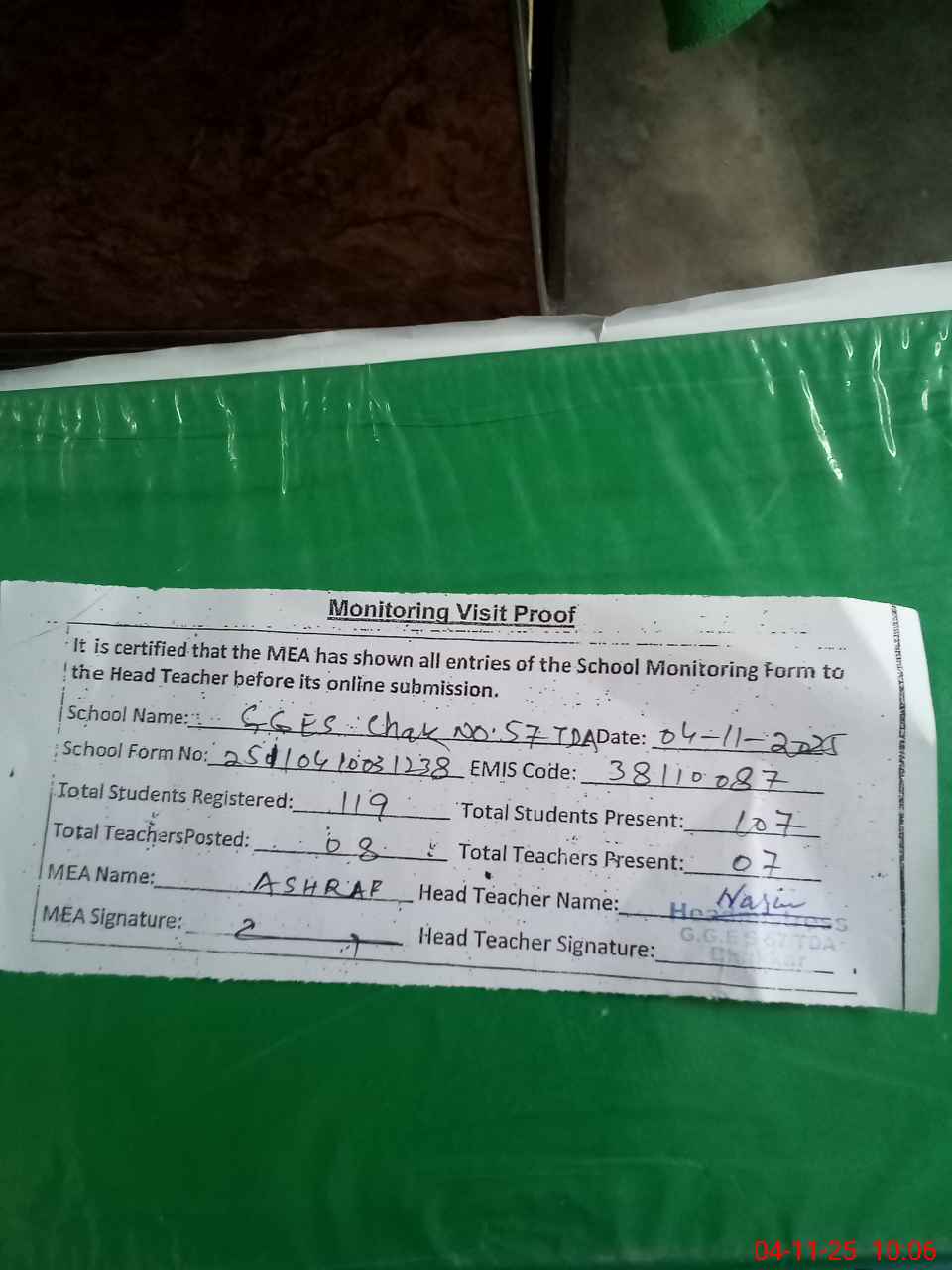 | Attendance Register | Head Teacher | MEA with School | Visit Proof |