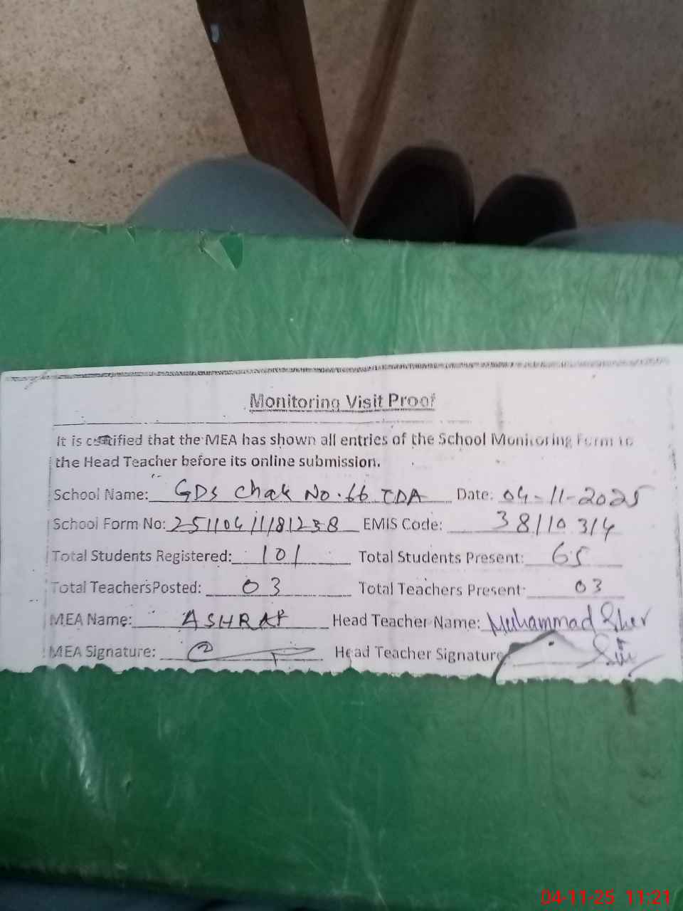 | EMIS Code: 38110314 | Name of School: GPS CHAK NO.66/TDA | |||