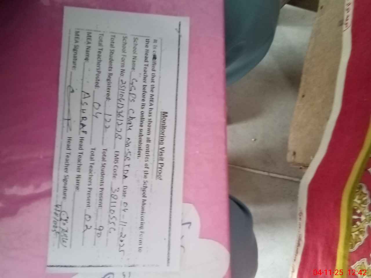 | Attendance Register | Head Teacher | MEA with School | Visit Proof |