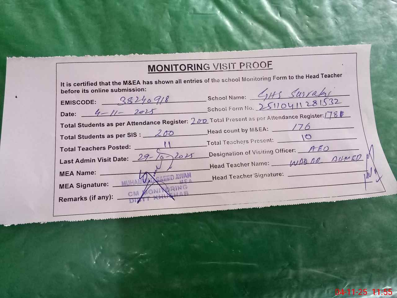 | Remarks (Use Separate Page if Required): Students on SIS Qty 200 Last admin visit on 29 October 2025 by AEO | |||||