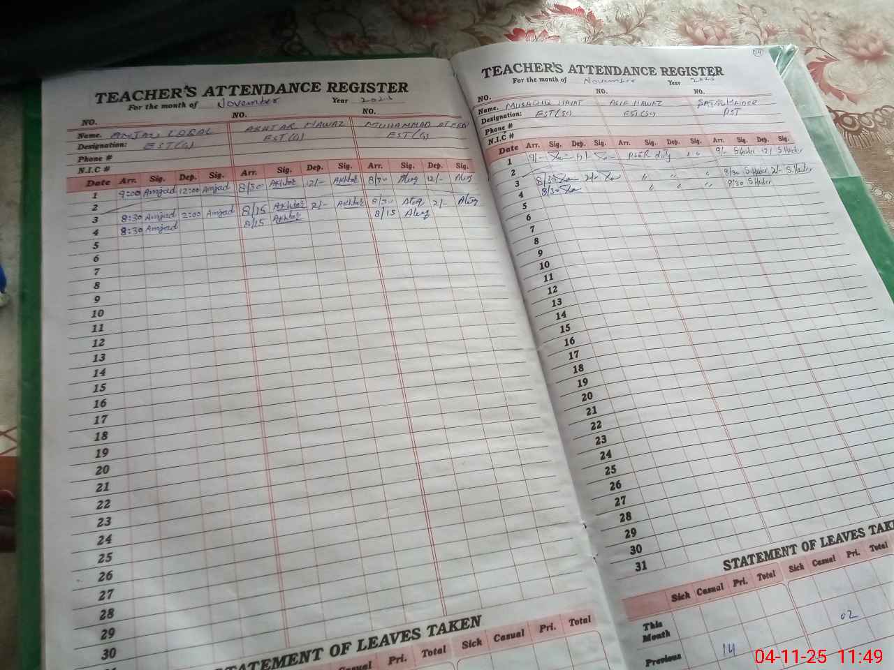 | CNIC | Full Name | Designation | R/C | Absence During Last Calender Month |