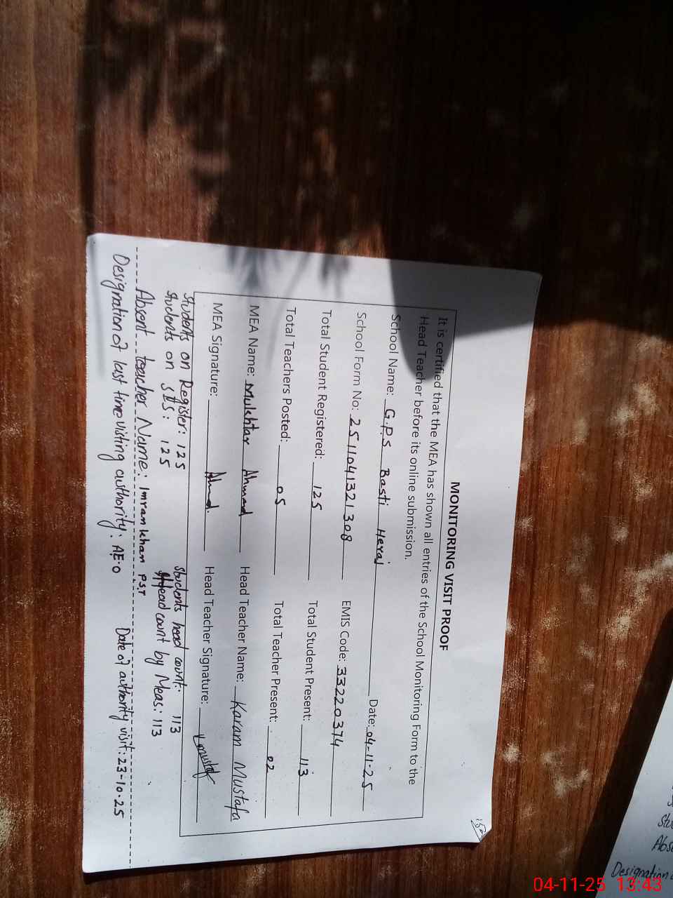 | Attendance Register | Head Teacher | MEA with School | Visit Proof |
