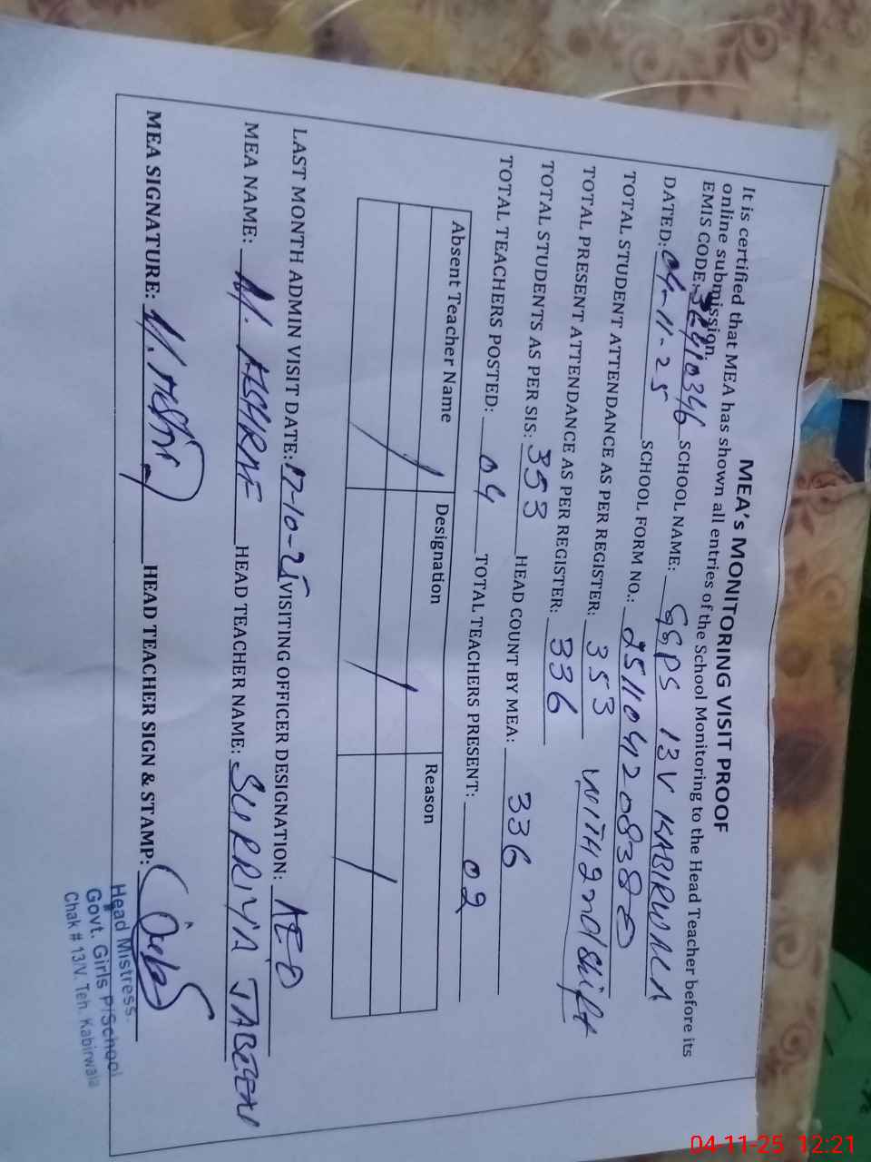 | EMIS Code: 36410346 | Name of School: GGPS 13/V, KABIRWALA | |||