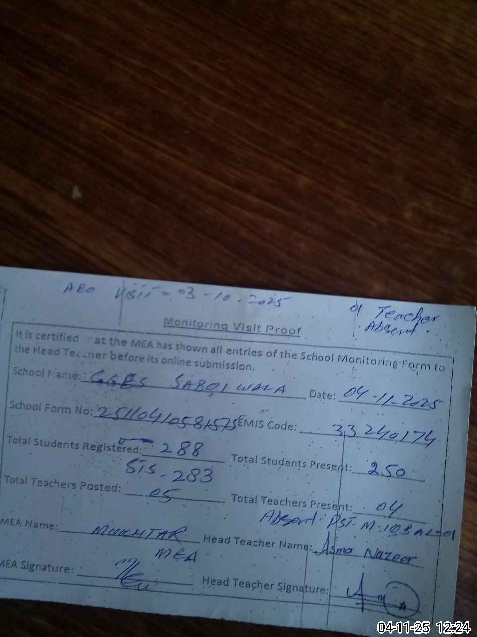 | Attendance Register | Head Teacher | MEA with School | Visit Proof |