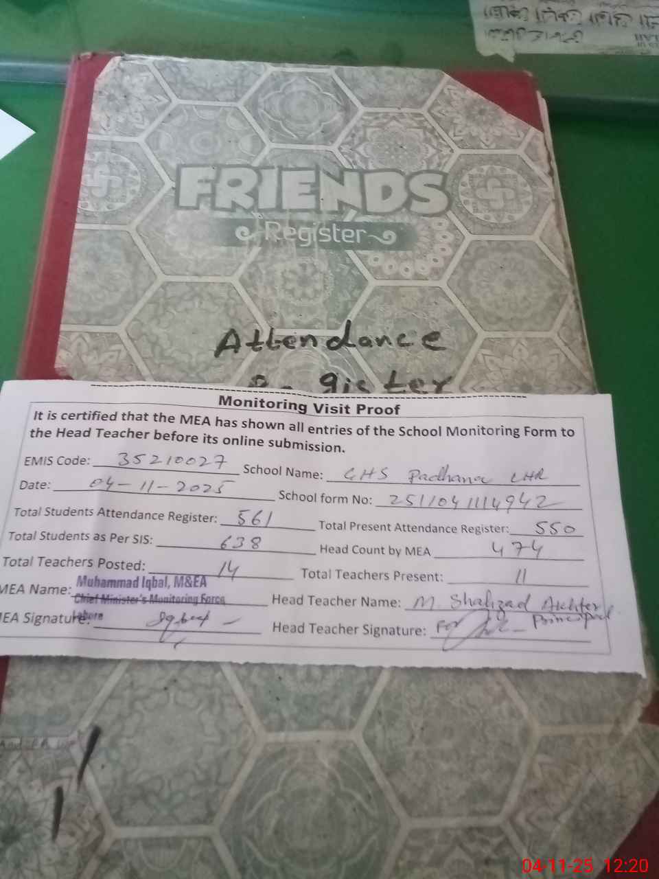| EMIS Code: 35210027 | Name of School: GHS PADHANA LAHORE | |||
