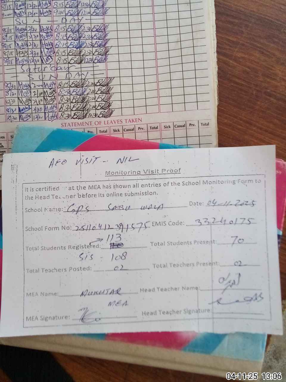 | Attendance Register | Head Teacher | MEA with School | Visit Proof |