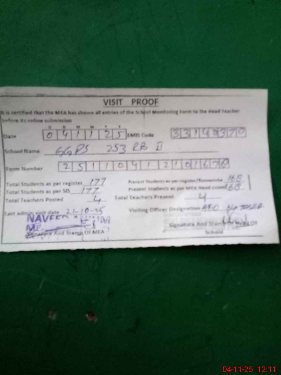 | Attendance Register | Head Teacher | MEA with School | Visit Proof |