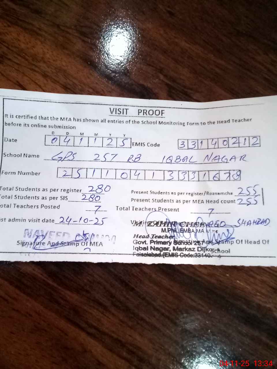 | EMIS Code: 33140212 | Name of School: GPS CHAK 257 RB IQBAL NAGAR | |||