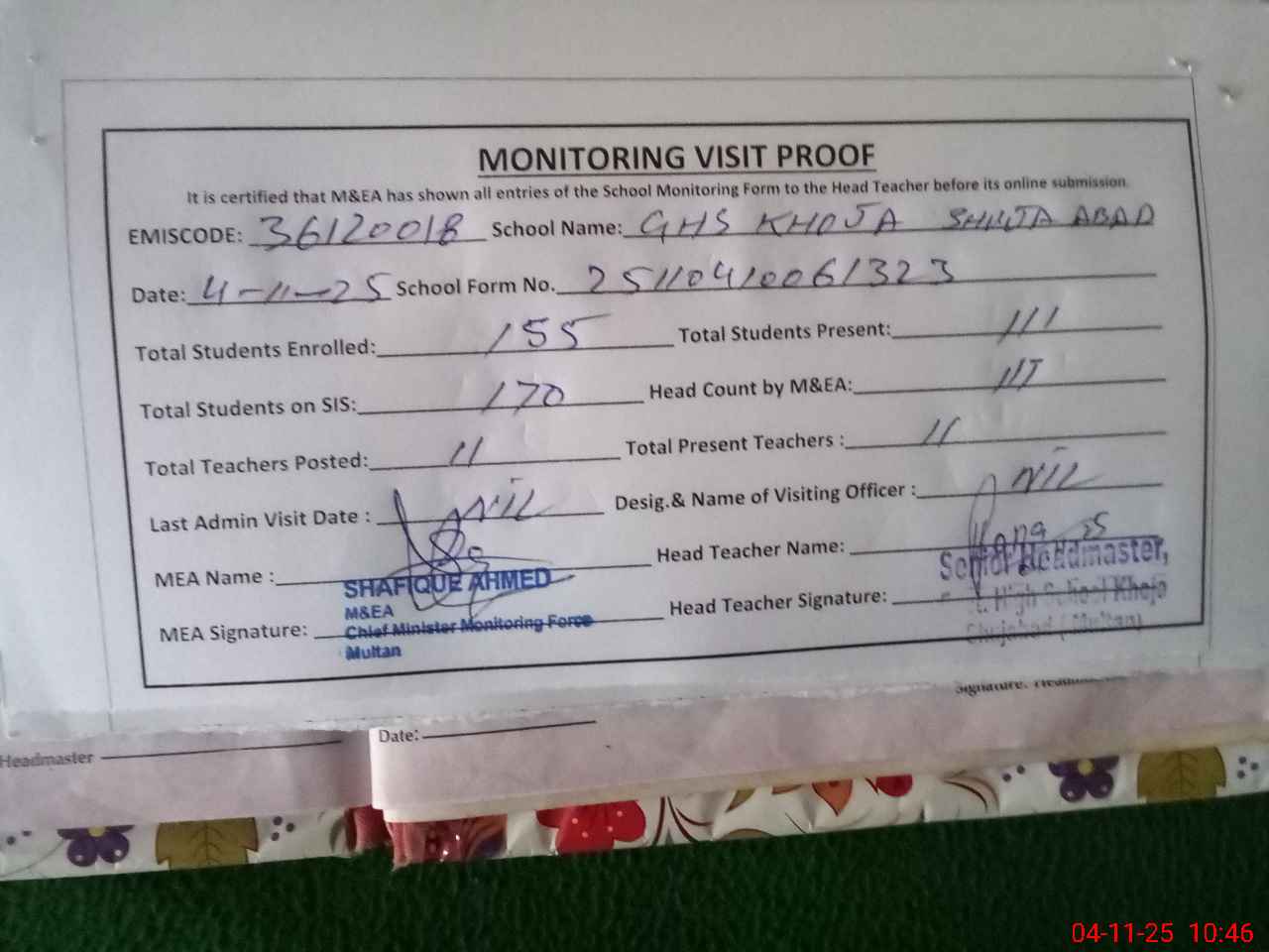 | EMIS Code: 36120018 | Name of School: GHS KHOJA P.O. KHOJA TEH. SHUJABAD DISTRICT MULTAN | |||