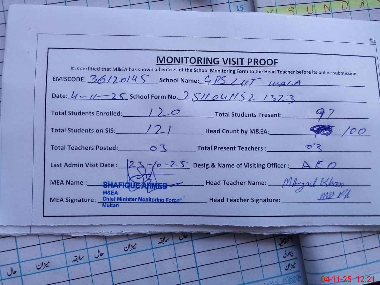 | Attendance Register | Head Teacher | MEA with School | Visit Proof |