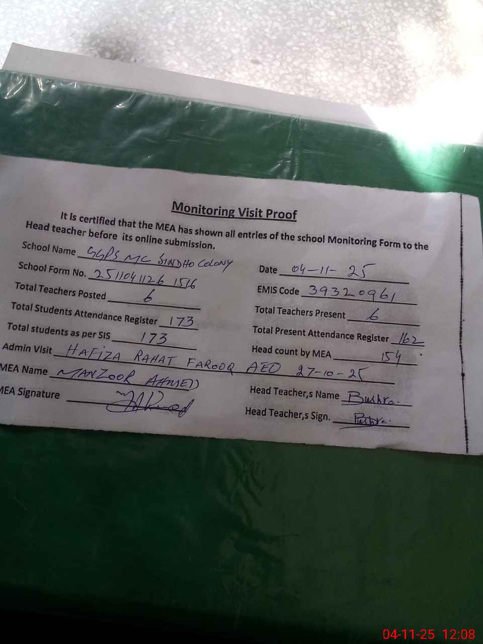 | Attendance Register | Head Teacher | MEA with School | Visit Proof |
