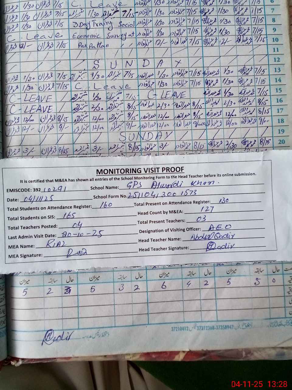 | EMIS Code: 39210291 | Name of School: GPS ALWARDI KHAN | |||