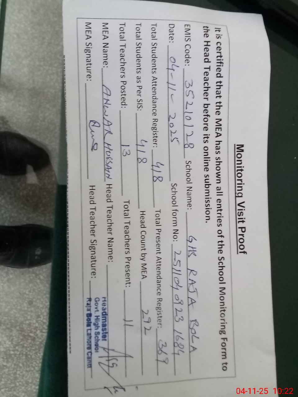 | Attendance Register | Head Teacher | MEA with School | Visit Proof |