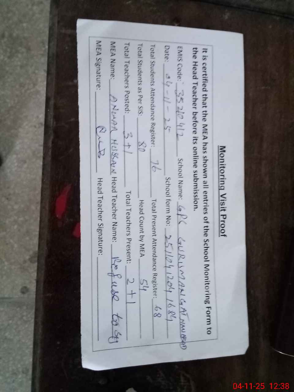 | Attendance Register | Head Teacher | MEA with School | Visit Proof |