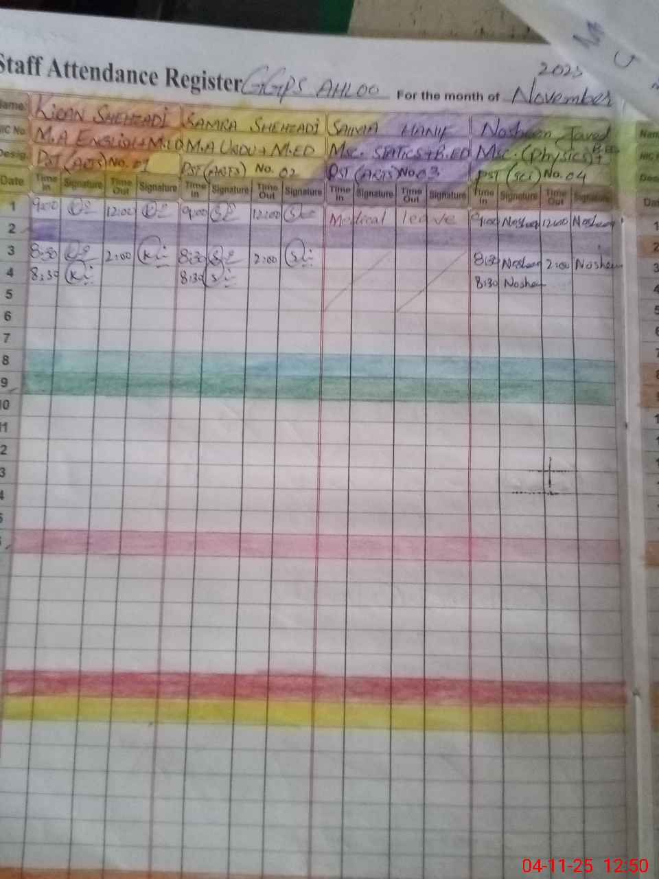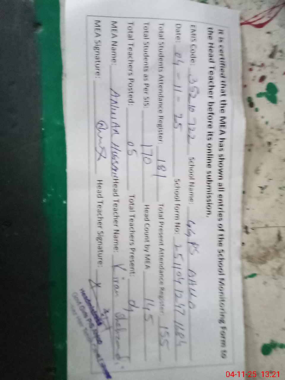 | Remarks (Use Separate Page if Required): Saima Hanif PST as per attendance register on medical leave wef 30 October 2025 Head Teacher AEO waiting for DEO Mark on medical leave School holding 02 class Room and 01 shed on roof with fiber roof ECE class on tab for attendance they were off attendance confirm on register 35210722 | |||||