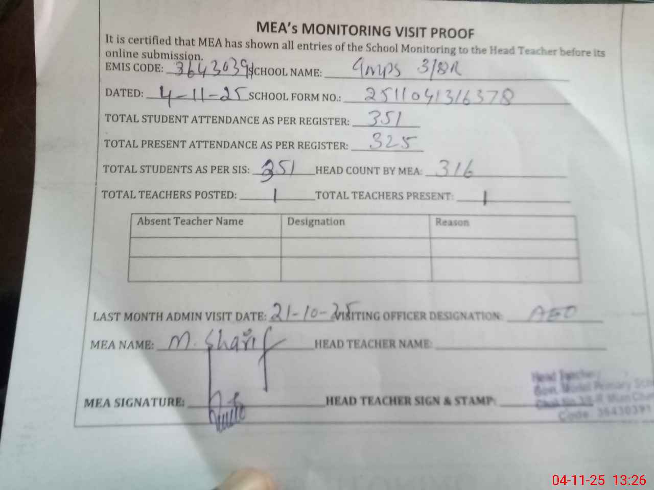 | Attendance Register | Head Teacher | MEA with School | Visit Proof |