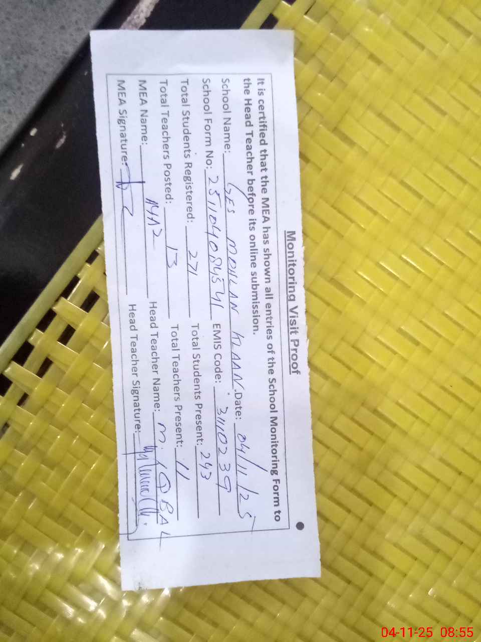 | Remarks (Use Separate Page if Required): GES mohlan klaan 31110239 Total students 271 present 243 gap 28 Students on sis 271 Total teachers 13 present 11 gap 2 Last visit aeo M Shoaib 21 10 25 | |||||