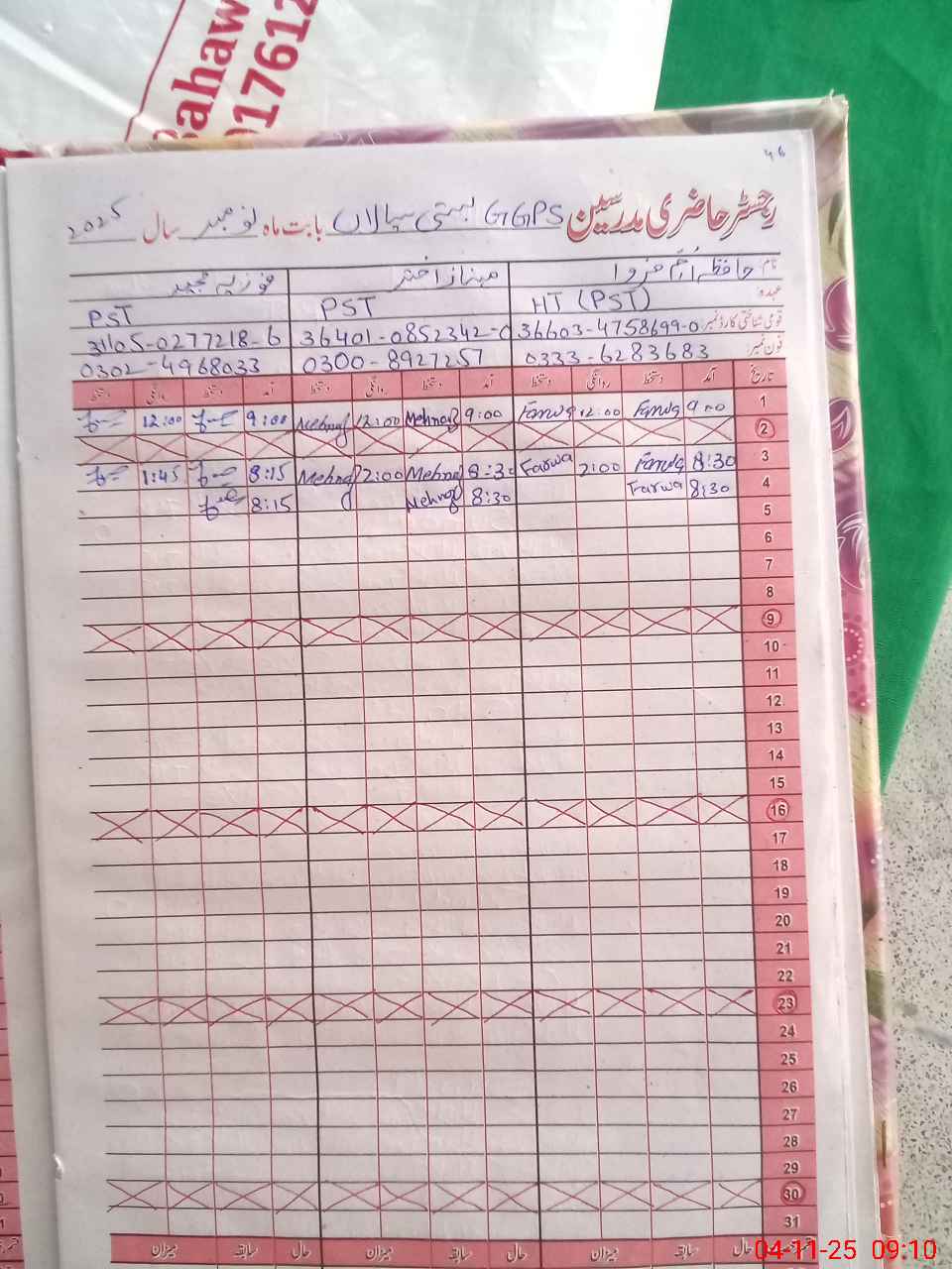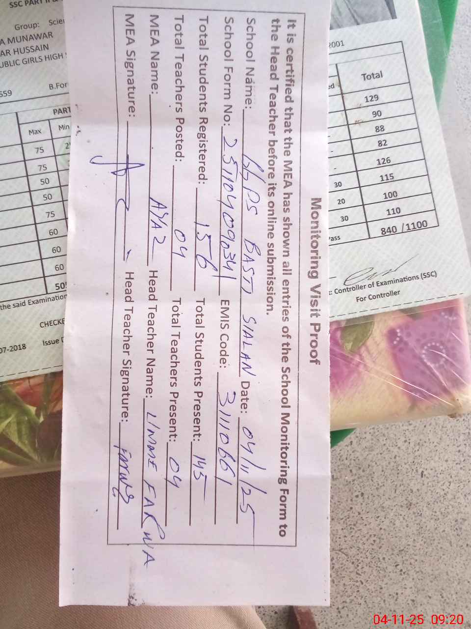 | Remarks (Use Separate Page if Required): GGPS basti Siallan 31110661 BWN Total teachers 4 present 4 gap zero Total students 156 present 145 gap 11 Last visit aeo 21 October | |||||