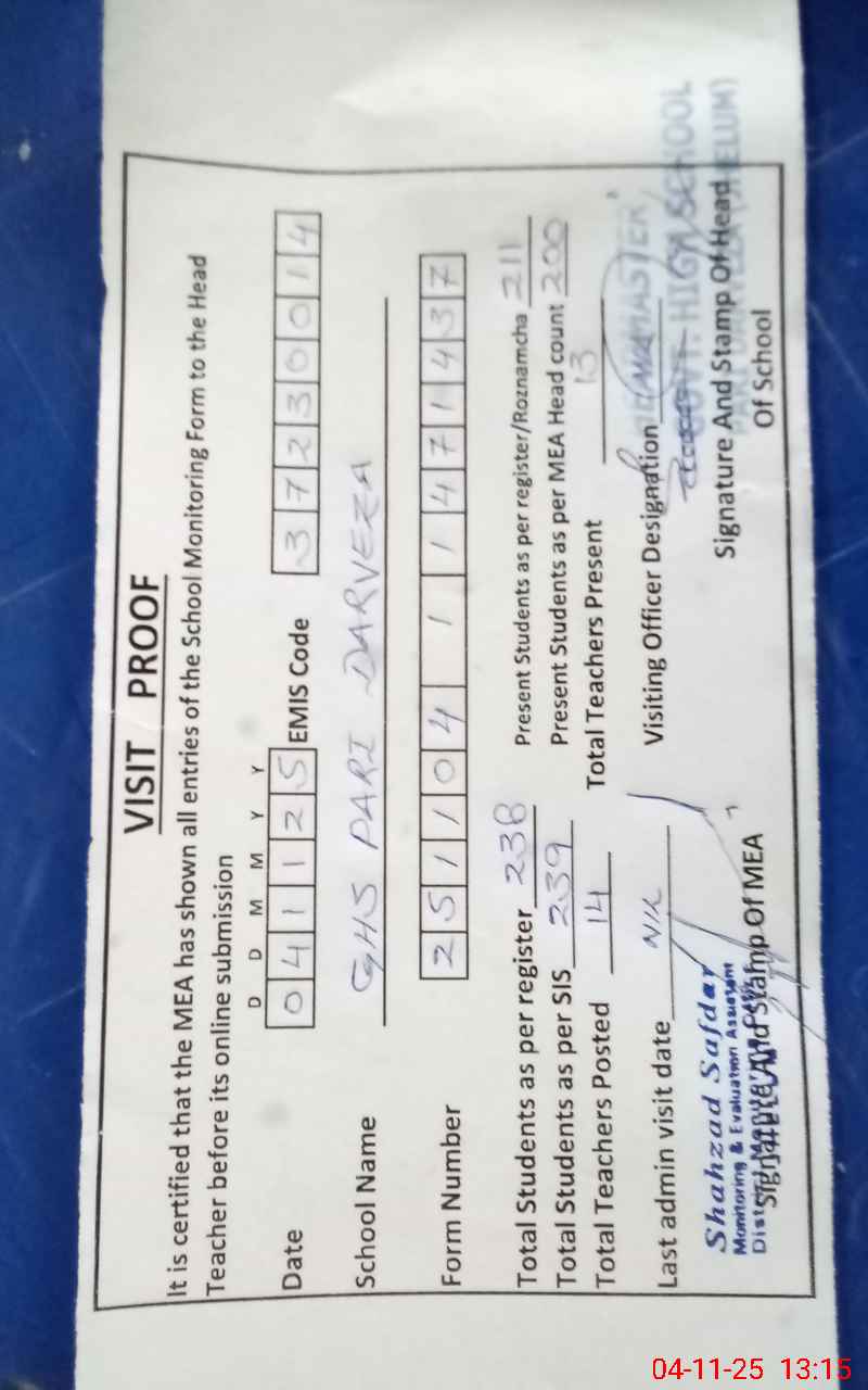 | EMIS Code: 37230014 | Name of School: GHS PARI DARVEZA | |||