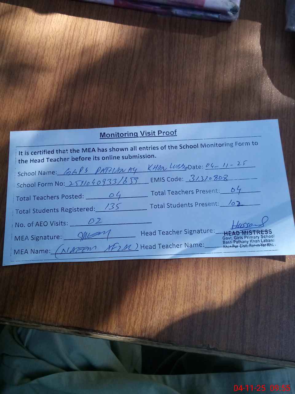 | Attendance Register | Head Teacher | MEA with School | Visit Proof |