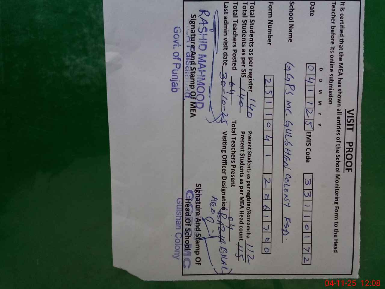 | EMIS Code: 33110172 | Name of School: GGPS MC GULSHEN COLONY | |||