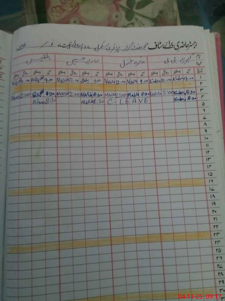 | CNIC | Full Name | Designation | R/C | Absence During Last Calender Month |