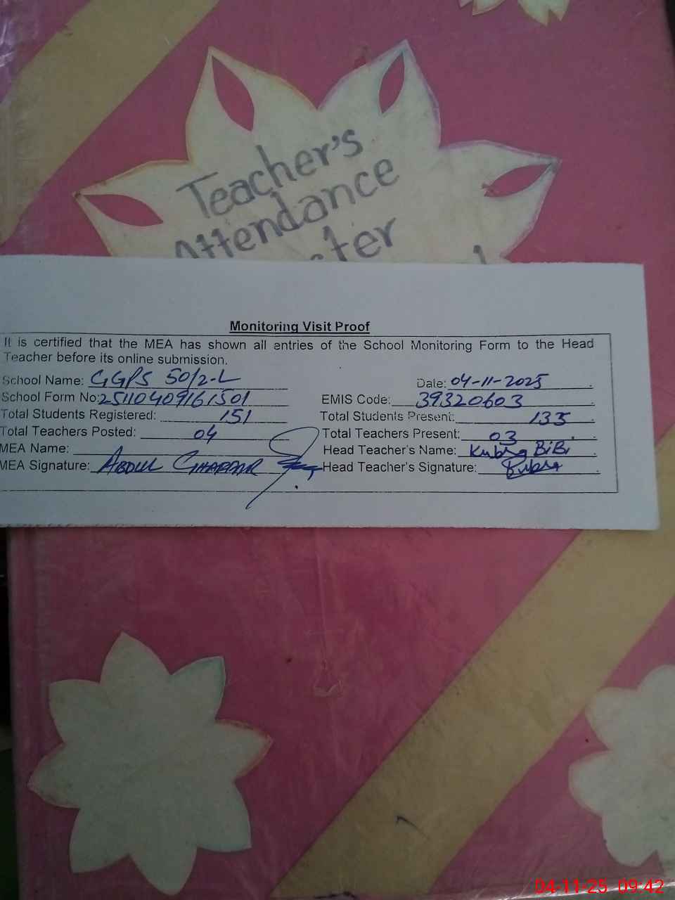 | Attendance Register | Head Teacher | MEA with School | Visit Proof |