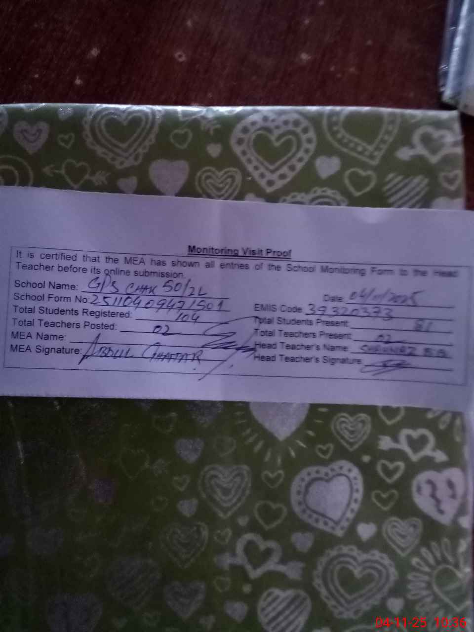 | Attendance Register | Head Teacher | MEA with School | Visit Proof |