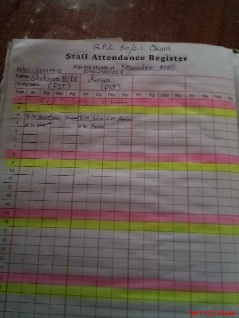 | CNIC | Full Name | Designation | R/C | Absence During Last Calender Month |