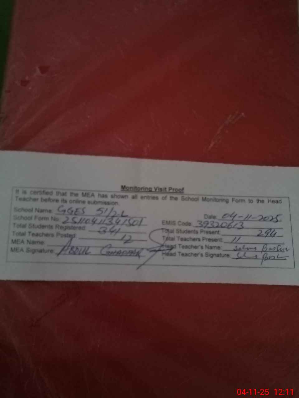 | Attendance Register | Head Teacher | MEA with School | Visit Proof |