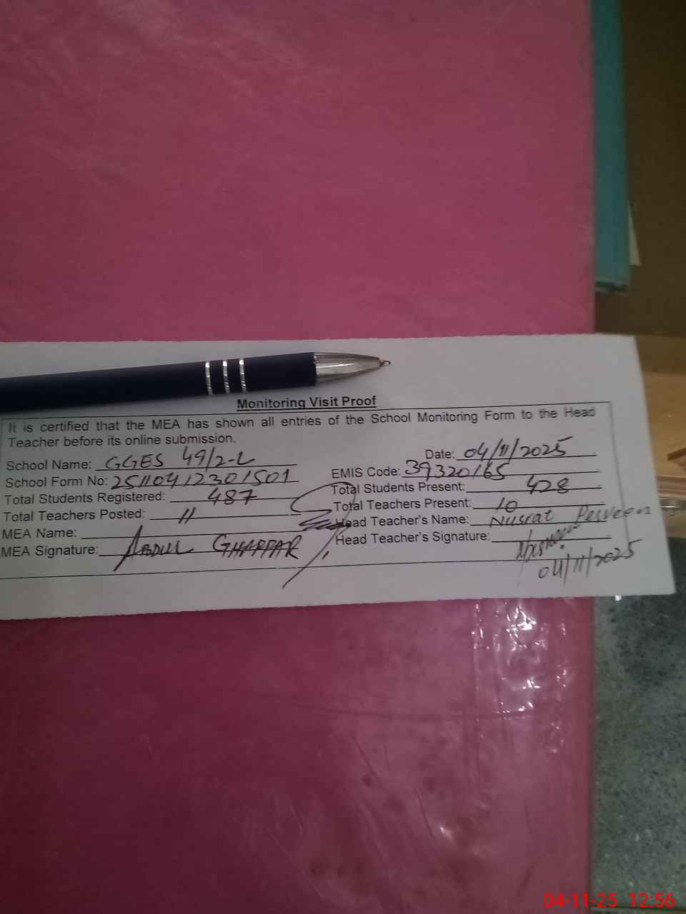 | Attendance Register | Head Teacher | MEA with School | Visit Proof |