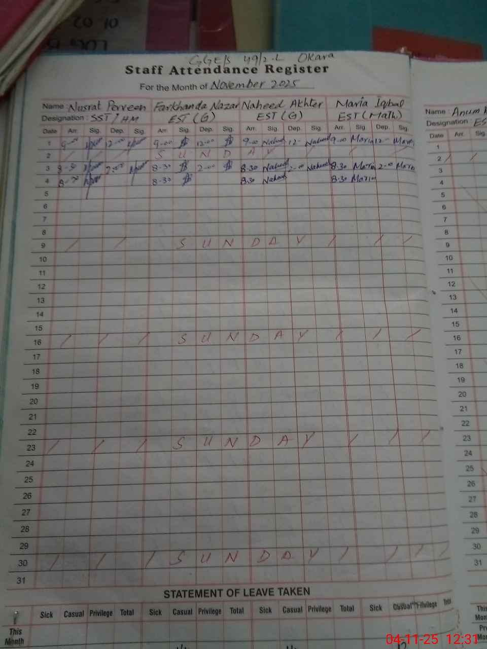 | Leave | Duty | Absent | Maternity | Medical | Ex- Pak |
