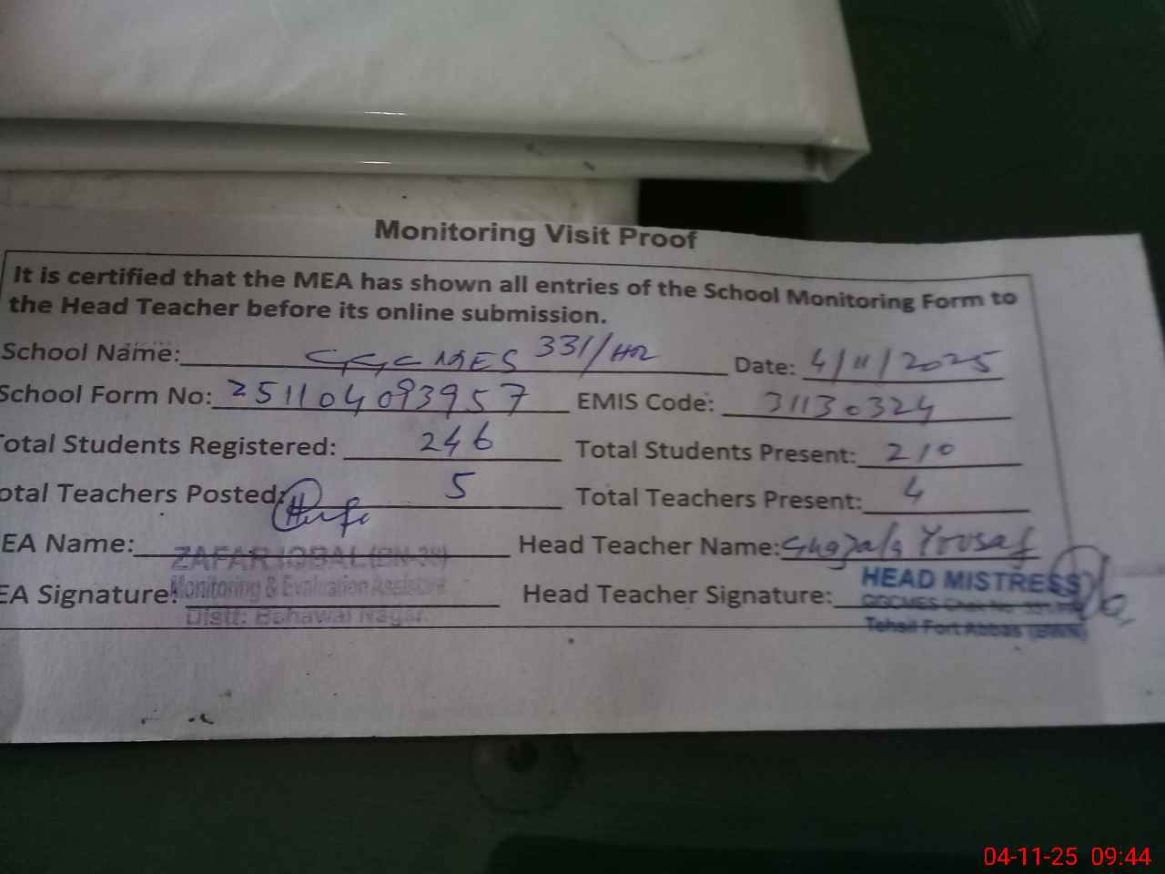 | EMIS Code: 31130324 | Name of School: GGCMES CHAK NO 331 HR | |||