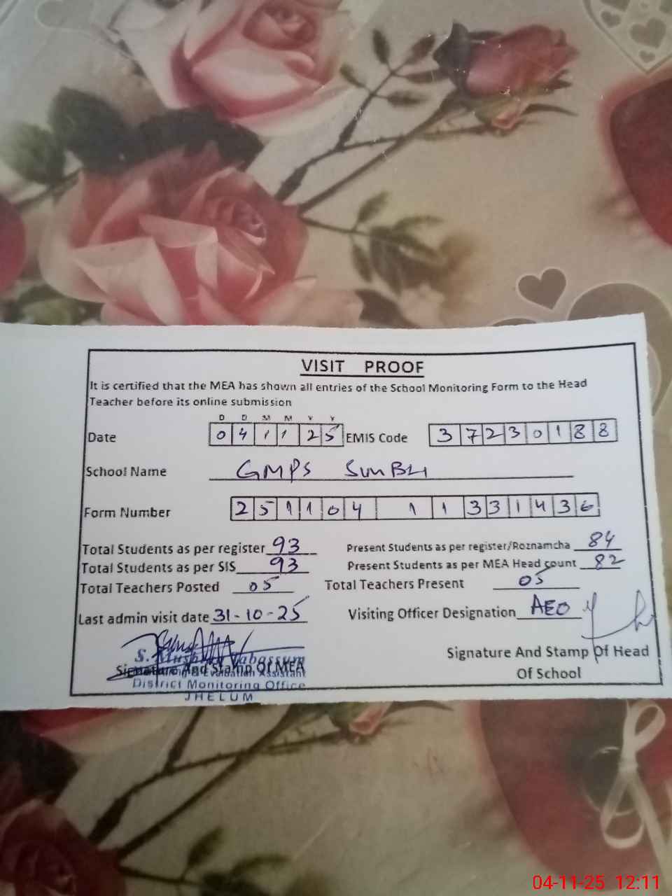| Attendance Register | Head Teacher | MEA with School | Visit Proof |