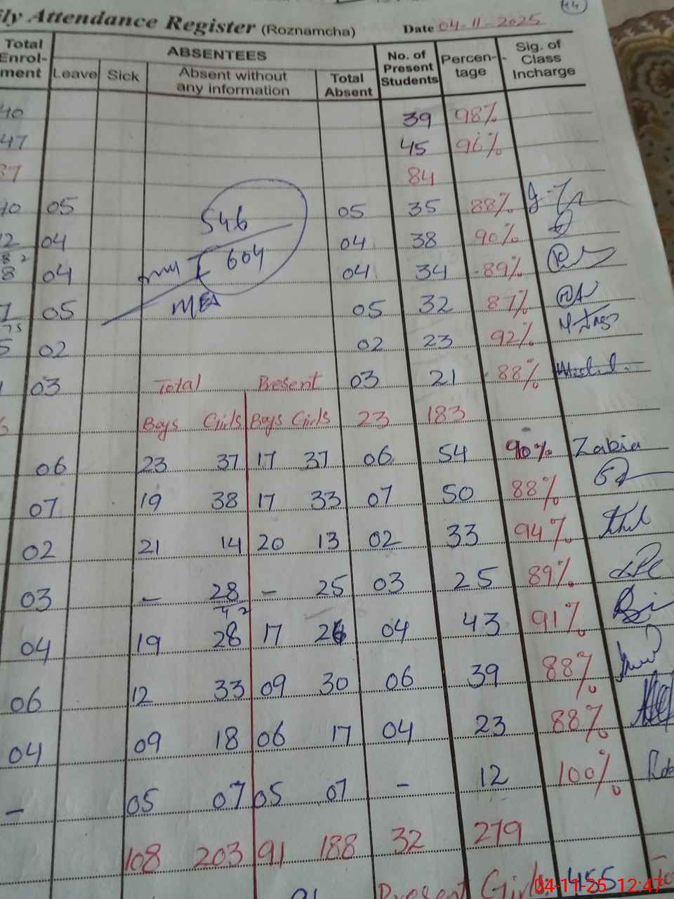 | Total Students Present | 12 | 0 | 23 | 39 | 43 | 58 | 50 | 54 | 44 | 66 | 73 | 45 | 39 | 546 | ||