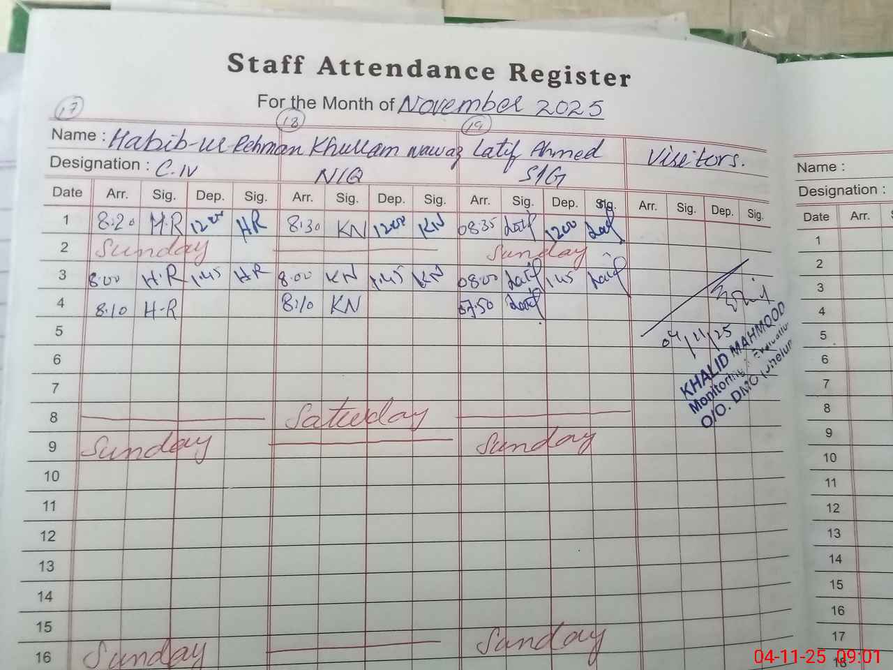 | Monitoring Date: 04-11-2025 | Start Time: 04-11-2025 08:45 AM | End Time: 04-11-2025 09:46 AM | Name of MEA: KH**** ME**** | |