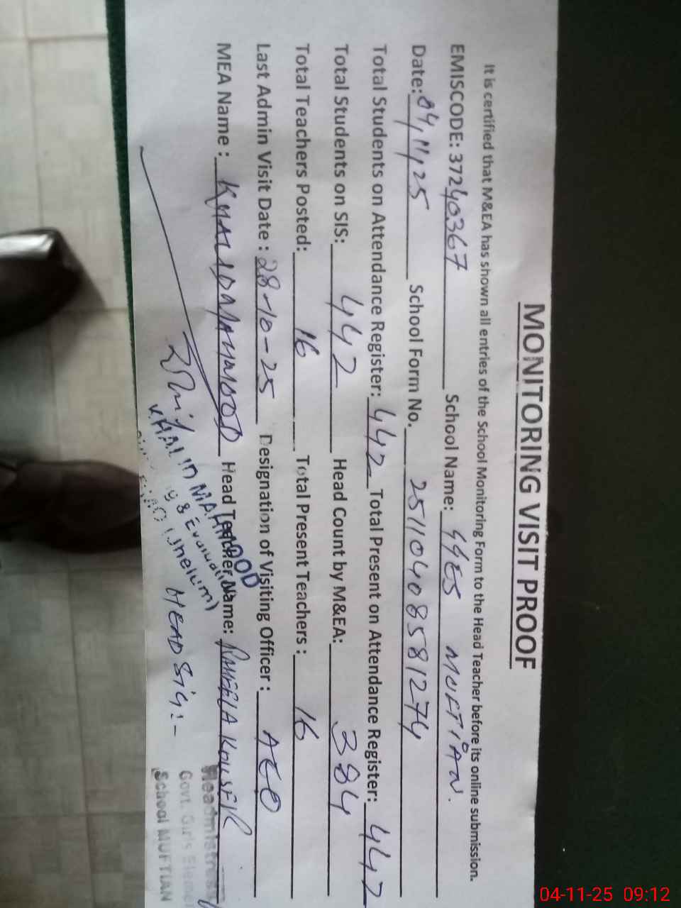 | Attendance Register | Head Teacher | MEA with School | Visit Proof |