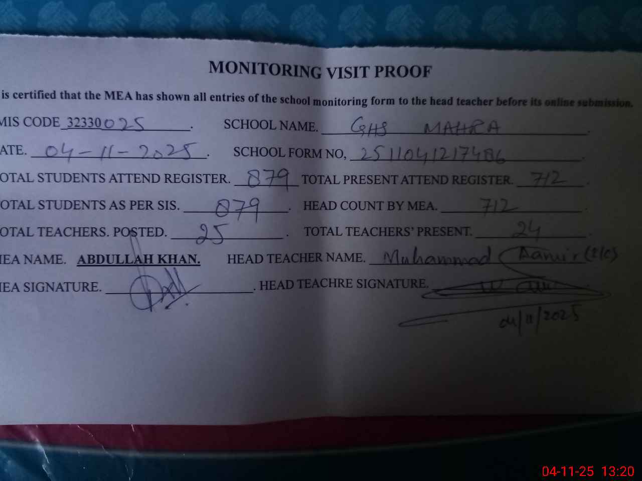 | Attendance Register | Head Teacher | MEA with School | Visit Proof |