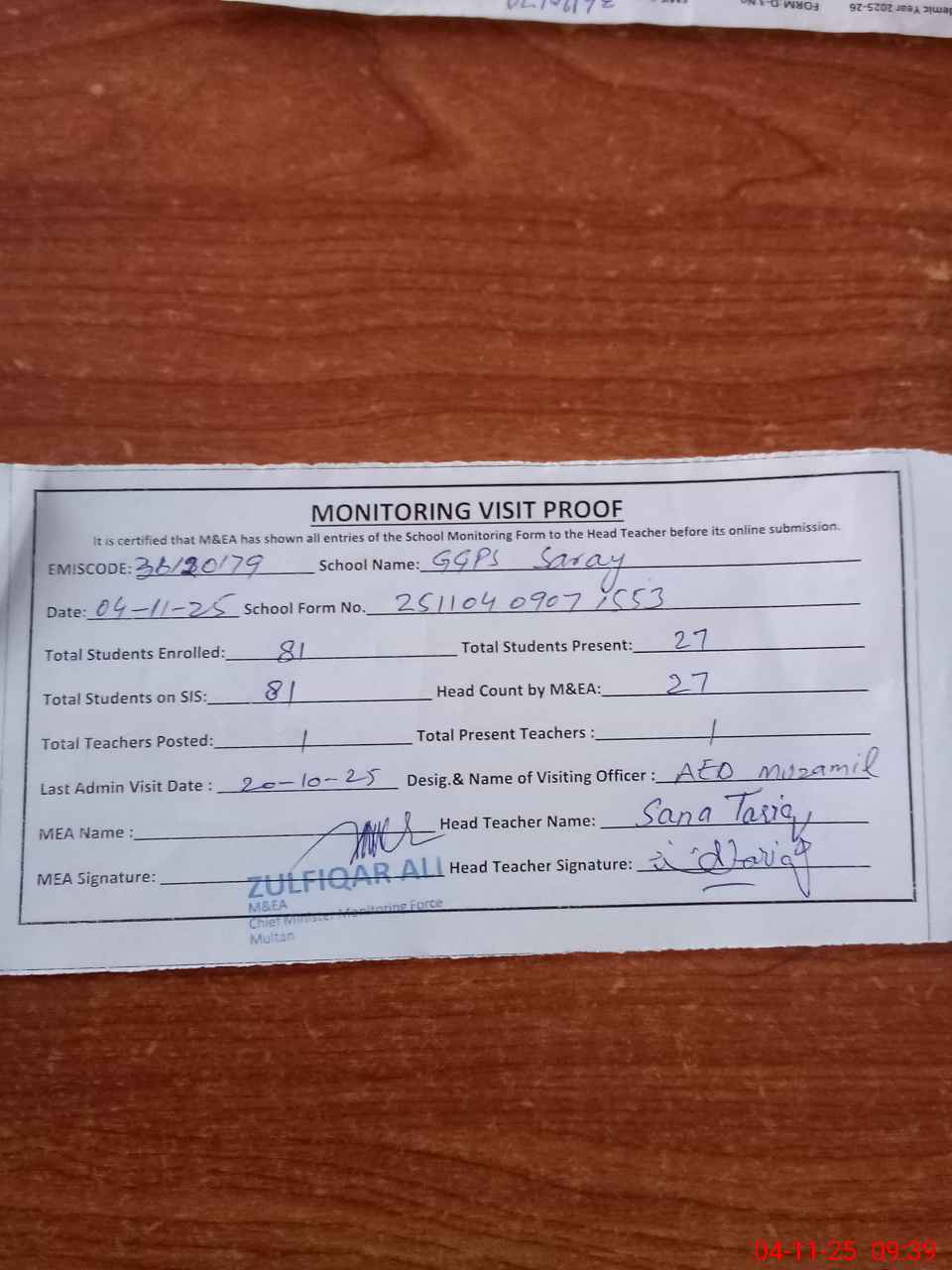 | EMIS Code: 36120179 | Name of School: GGPS SARAY TEH.SHUJABAD | |||